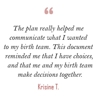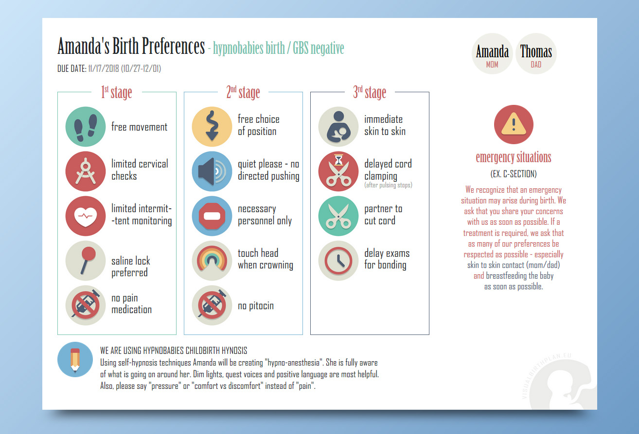 The visual birth plan is a great reminder to you and your birth team that you have choices and that you can make decisions together. Aside from the birth preferences for all stages of labor, the visual birth plan can include six helpful questions to be asked in case of emergencies, names and roles of people on your birth team and crucial details about your pregnancy and health.